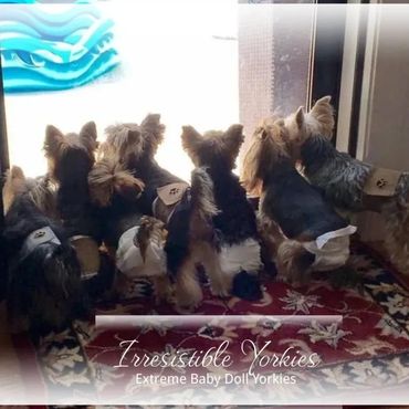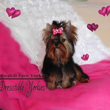 Here at Irresistible Yorkies we specialize for perfection. We have been raising "Extreme Baby Doll Yorkies" for 30 years now and strive for HEALTH, CALMNESS, INTELLIGENCE, STRUCTURE, QUALITY. Our babies are very loving & personable because they are handled everyday and loved on from the time they are born. The adults are Baby Doll Face Yorkie with a calm & loving demeanor. Our parents are all tested, & examined for over all health. As we truly care about what we produce. We are dedicated to breeding "Extreme Baby Doll Yorkies" that are healthy, and live a long happy healthy life. We carefully select our breeding pairs based on a variety of factors, Our babies reflect the unique personality and loving demeanor, I am told this often by my special customers. This is what has made us #1 in Repeat Customers & 5 Star Rating in USA! I love to see all the updated pictures of my babies I've produced. and how well they are doing,